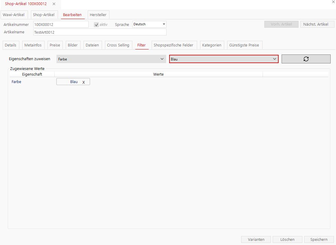 Navigieren Sie jetzt in den gewünschten Artikel, in den Reiter Filter. Dort können Sie die gewünschten Filter dem geöffneten Artikel hinzufügen. Im Anschluss muss der Artikel noch gespeichert werden.